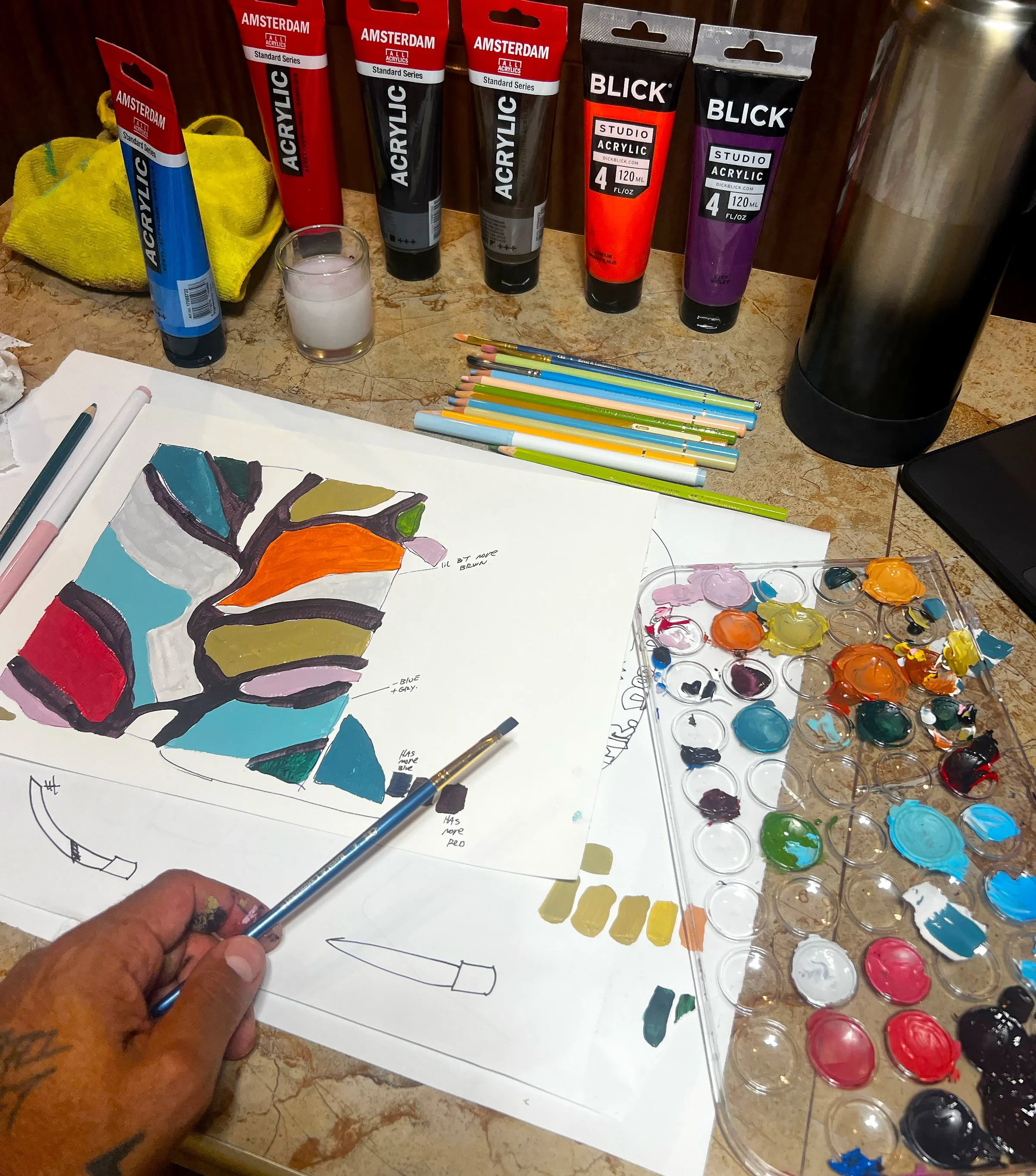 Hand-painted abstract mural with vibrant natural earth tone colors that honor the wine-country region. This little Air B&B is beautifully nestled in the coastal hills of Mexico and internationally known as a premier travel destination.
